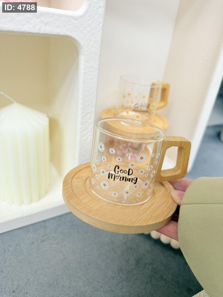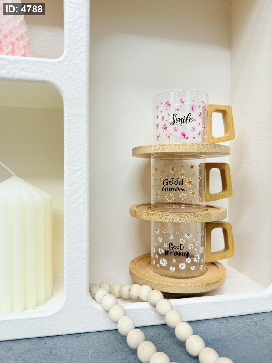 طقم فناجين مع كوستر خشب بامبو مكون من 6 فناجين و 6 كوسترات