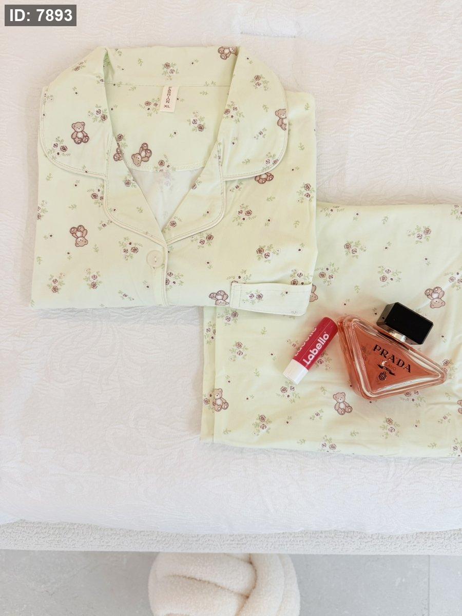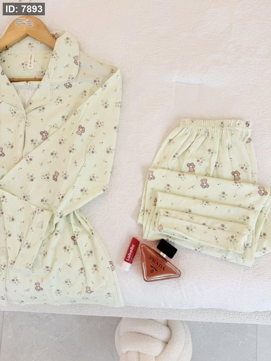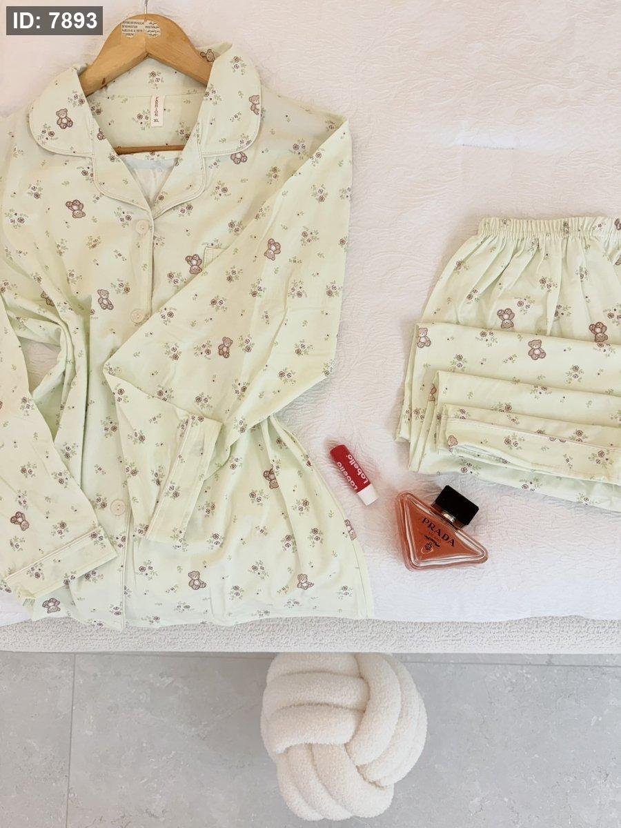بيجامة دب وورد اخضر فاتح كم